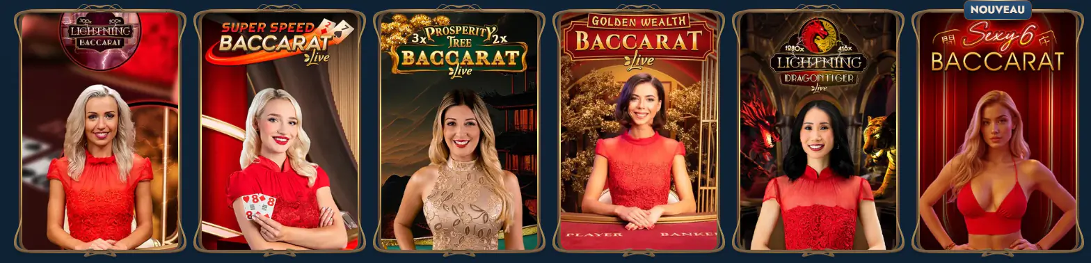 Jeu de carte populaire dans le milieu des jeux casino en ligne, les mordus français de Baccarat seront servis sur Rich Royal Casino Jeu. En effet, nous disposons de plusieurs modèles de ce jeu et chaque modèle a ses propres fonctions, caractéristiques et règles. Nous avons entre autres les jeux baccarat classiques, les minis baccarat et ceux en live sur Rich Royal Casino Jeu. Prenez le soin de lire les instructions de chaque jeu avant de lancer une partie. Il faut noter que vous pouvez jouer à tous ces jeux automatiques depuis votre smartphone IOS et Android. Comme exemple de jeux baccarat nous avons par exemple: