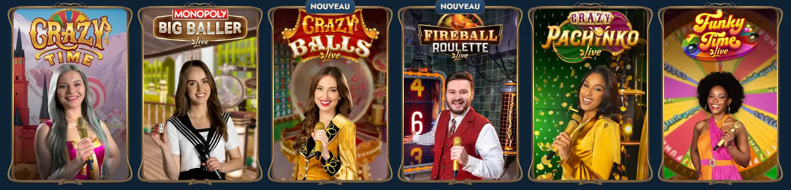 Pour un voyage rapide et excitant au cœur des émissions télévisées, vous devez rejoindre Rich Royal Casino. En effet, nous disposons sur notre site web et application mobile (IOS et Android) de plusieurs émissions télévisées sur lesquelles vous pouvez parier sur le casino en direct. Ces jeux de télévision fournis par Evolution Gaming et Pragmatic Play Live ont un design et une qualité de transmission moderne avec de vrais croupiers. En plus, les multiplicateurs que nous proposons sur le Casino Rich Royal défie toute concurrence. Prenez le soin de vérifier la qualité de votre connexion avant de lancer une partie. Vous trouverez des jeux télévisés comme par exemple: